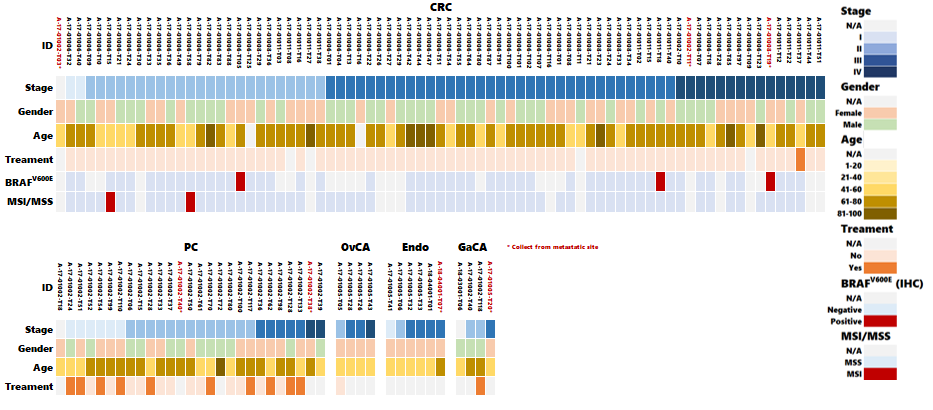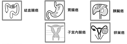 CRC, colorectal cancer 大腸直腸癌; PC, pancreatic cancer 胰臟癌; OvCA, ovarian cancer 卵巢癌; Endo, endometrial cancer 子宮內膜癌; GaCA, gastric cancer 胃癌